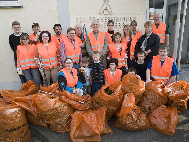 Die Keglervereinigung Heidelberg e.V. hat vermutlich den jüngsten Teilnehmer zum Mitputzen motivieren können. Die gesamte Gruppe war am 18. April voller Elan und mit viel Spaß mit dabei und klaubte diverse große und kleine Abfälle aus den Büschen und Wegen im Bereich der Rudolf-Diesel-Straße. (Foto: Rothe)