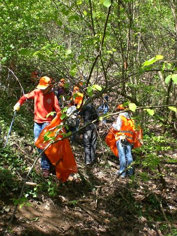 CIMG0721.JPG - Die freiwilligen Helfer/innen putzten gut ausgerüstet mit Zangen, Handschuhen und Müllsäcken quer durch den Wald. Auch kleine Kletterpartien waren kein Hindernis. Anschließend wurde gegrillt. (Foto: Stadt Heidelberg)