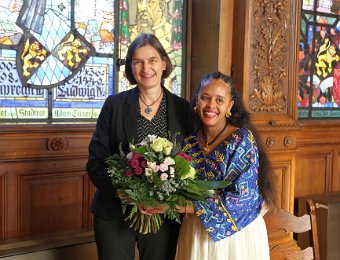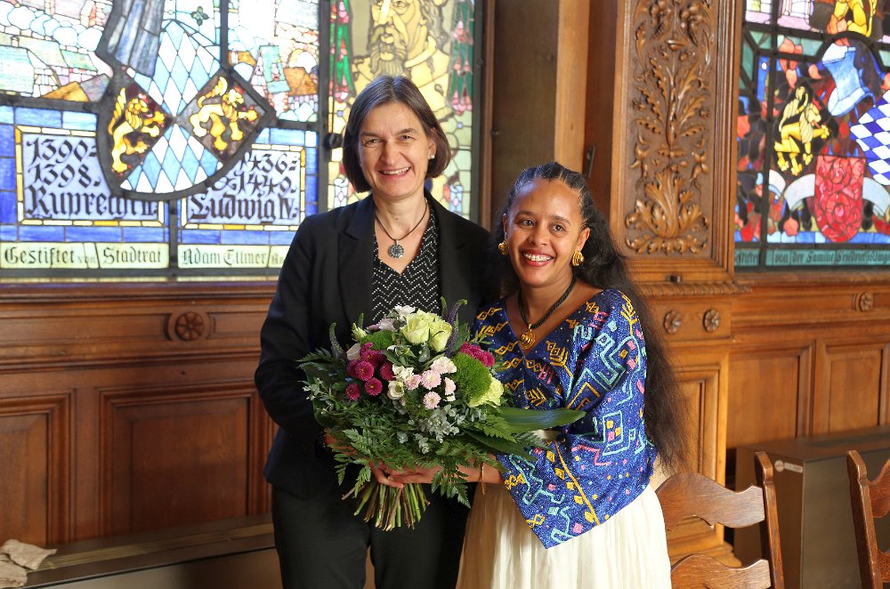 Bürgermeisterin Martina Pfister (links) überreicht neben der 1.000 Einbürgerungsurkunde 2025 auch einen Blumenstrauß an Bilen Schulz. (Foto: Stadt Heidelberg) -…