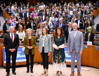 Oberbürgermeister Eckart Würzner (Mitte hinten) und 150 weitere europäische Bürgermeiste-rinnen und Bürgermeister beim Meet&Greet mit EU-Parlamentspräsidentin…