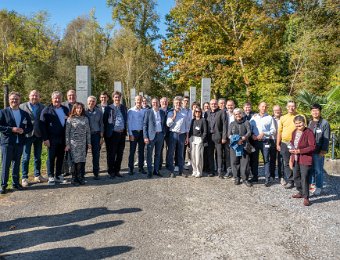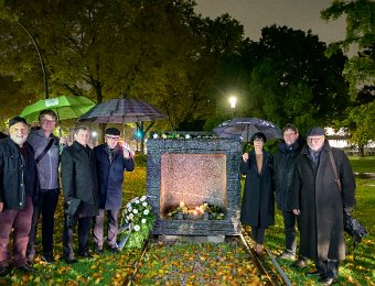 Beim Gedenken an die Opfer von Gurs am Mahnmal in der Schwanenteichanlage (von links): Helmut Haas (Schatzmeister GCJZ Heidelberg), Pfarrer Mirko Diepen…