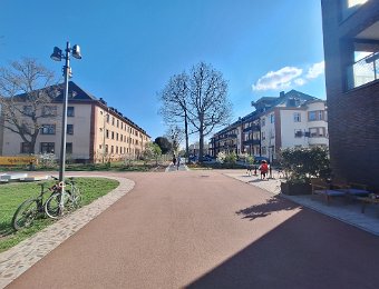 Das verkaufte Gebäude (links) liegt zentral in der Nähe des Paradeplatzes und am Fußweg der Adelheid-Steinmann-Straße. (Foto: Entwicklungsgesellschaft Campbell…