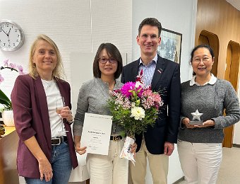 Zhan Zhu (2. von links) wurde als Beste im Bereich Medizin und Pharmazie mit dem Heidelberger Ausbildungspreis 2024 geehrt – bei der Ehrung gemeinsam mit (von…