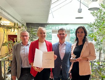 Carolin Fentz (2. von links) freut sich mit (von links) Frank Stawinski (Leiter Akademie für Gesundheitsberufe), Marc Massoth (Leiter Amt für…