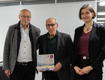 Herausgeber und ehemaliger Stadtarchivdirektor Dr. Peter Blum (v.l.), Autor Dr. Steven Less und Bürgermeisterin Martina Pfister präsentieren die neue…