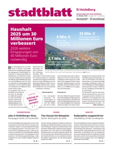 KINDERBETREUUNG Jobs in Heidelberger Kitas Kampagne wirbt um Fachkräfte Die Stadt Heidelberg hat gemeinsammit den städtischen Kitas und den über 40 freien und privat-gewerblichen Trägern von Kindertageseinrichtungen eine Kampagne gestartet. Unter dem Motto „It’s a match! Kitas in Heidelberg und Du!“ wollen sie gemeinsam Fachkräfte für die frühkindliche Bildung und Betreuung gewinnen. Mit pädagogisch hoher Qualität in den Kindertageseinrichtungen sollen Fachkräfte für diese wichtige Tätigkeit begeistert werden. S. 4 › WOHNEN Tiny Houses bei Messplatz Neuer Wohnpark ab 2026 Auf einer bislang unbebauten städtischen Fläche am Harbigweg im Stadtteil Kirchheim entsteht ein TinyHouse-Wohnpark. Insgesamt 36Wohneinheiten sind mit hohemWohnkomfort auf kleinemRaumgeplant. Besonderer Wert wird dabei auf Nachhaltigkeit, Rückbaubarkeit und soziale Integration gelegt. Bei der Vermietung eines Wohnmoduls orientieren sich die Projektentwickler an den ortsüblichen Mieten für kleinere Apartements, die alle Altersgruppen ansprechen sollen. S. 5 › MOBILITÄT Radprojekte ausgezeichnet Heidelberg erhält Landespreis Die Stadt Heidelberg ist beim Landespreis Radinfrastruktur Baden-Württemberg 2025 als Gewinnerkommune ausgezeichnet worden. Prämiert wurde die Radwegeachse Bahnstadt – Neuenheimer Feld als kommendes Schlüsselprojekt für den Rad- und Fußverkehr in Heidelberg sowie als Beispiel für innovative Radinfrastruktur im städtischen Umfeld. Herzstücke sind die Gneisenaubrücke (Arbeitstitel) und eine weitere geplante Rad- und Fußgängerbrücke über den Neckar. S. 6 › Amtsanzeiger der Stadt Heidelberg 15. Oktober 2025 / Ausgabe 28 / 33. Jahrgang Der Gemeinderat hat am Mittwoch, 8. Oktober, mit großer Mehrheit ein Sofortprogramm gegen die angespannte Haushaltslage beschlossen: Es umfasst eine Reihe von Maßnahmen zur deutlichen Verbesserung des Ergebnisses im laufenden Geschäft der Stadt Heidelberg für 2025 von rund 30 Millionen Euro. Für 2026 ist nochmals ein Nachtragshaushalt vorgesehen, in dem Verbesserungen von mindestens 40 Millionen Euro erzielt werden sollen. Es ist geplant, dass der Gemeinderat noch imDezember über ein detailliertes Maßnahmenpaket für 2026 entscheidet. Dadurch sollen insbesondere auch Zuwendungsempfänger noch vor dem Jahreswechsel Klarheit für ihre Planungen für 2026 erhalten. Der Nachtragshaushalt 2026 soll im März verabschiedet werden. Die Verbesserungen im laufenden Geschäft sind zwingend erforderlich, damit die Stadt Heidelberg vom Regierungspräsidium wieder die Genehmigung erhalten kann, ordentliche Kredite für neue Investitionen aufnehmen zu können. Sofortprogramm Das Sofortpaket beinhaltet Verbesserungen im Ergebnishaushalt von 30,1 Millionen Euro in 2025: Die Verwaltung spart davon allein 5 Millionen Euro ein, bei den Zuschussempfängern sollen insgesamt 2,1 Millionen Euro eingespart werden. Hinzu kommen Verbesserungen aus dem aktuellen Verlauf des Jahres 2025 in Höhe von 23 Millionen Euro gegenüber den Planungen. Hintergrund Mit dem Maßnahmenpaket kommt die Stadt Heidelberg Forderungen des Regierungspräsidiums (RP) Karlsruhe nach. Die Aufsichtsbehörde hat zwar die Gesetzmäßigkeit des Haushalts 2025/26 bestätigt, aber keine Genehmigung für die avisierten Kredit- und Verpflichtungsermächtigungen erteilt. Das RP forderte die Stadt auf, Subventionen und andere freiwillige Leistungen abzubauen. Zudem solle bei Erfüllung der Pflichtaufgaben darauf geachtet werden, Standards auf das unbedingt Notwendige hin zu untersuchen. Die finanzielle Lage fast aller Kommunen bundesweit hat sich in den vergangenen Jahren erheblich verschlechtert. Ein Hauptgrund ist die Überlastung der Kommunen durch Gesetze von Bund und Land, die nicht gegenfinanziert werden. chb Mehr auf Seite 5 › Haushalt 2025 um 30 Millionen Euro verbessert 2026 weitere Einsparungen von 40 Millionen Euro notwendig ENERGIE Infotag zu Wärme- pumpen S. 7 › www.stadtblatt. heidelberg.de www.heidelberg.de/ bekanntmachungen 2,1 Mio. € werden bei Zuschuss- empfängern angepasst 23 Mio. € Verbesserungen im laufenden Haushalt 5 Mio. € spart die Verwaltung zusätzlich ein Drei wesentliche Bausteine tragen zur Verbesserung des städtischen Haushalts 2025 um 30 Millionen Euro bei. Rund fünf Millionen Euro davon sind Einsparungen in der Verwaltung. (Foto Diemer)