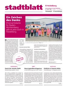 Amtsanzeiger der Stadt Heidelberg 21. Januar 2026 / Ausgabe 2 / 34. Jahrgang ARBEIT Neue Jugendberufsagentur Unterstützung aus einer Hand Stadt, Rhein-Neckar-Kreis und die Agentur für Arbeit Heidelberg haben am Freitag, 16. Januar, gemeinsam die Jugendberufsagentur Rhein-Neckar-Kreis/ Heidelberg eröffnet. Hier sollen junge Menschen unter 25 Jahren passgenau, niedrigschwellig und aus einer Hand unterstützt werden – damit es mit dem Einstieg ins Berufsleben oder die passende Ausbildung klappt. Ein besonderes Augenmerk liegt dabei auf jungen Menschen mit erschwerten Startbedingungen. S. 5 › JAHRESAUSBLICK Damit der Verkehr fließt Mobilitätsprojekte 2026 2026 werden in Heidelberg viele wichtige Projekte im Mobilitätsbereich vorangetrieben. Die Montpellierbrücke wird im Frühjahr fertig, während für die Ziegelhäuser Brücke die Planungen für Abbruch und Neubau voranschreiten. Die Deutsche Bahn beginnt mit der Sanierung des Hauptbahnhofes. Ein weiteres Fahrradparkhaus soll Ende des Jahres nutzbar sein. Zudemwerden Maßnahmen zur Verbesserung der Verkehrssicherheit durchgeführt. S. 3 › AUSSTELLUNG Einblicke in Staecks Höhle Heidelberger Collagekünstler In Kooperation mit der Stiftung ReichspräsidentFriedrich-Ebert-Gedenkstätte würdigt die Stadt Heidelberg ab dem 30. Januar das Werk des Heidelberger Künstlers Klaus Staeck. Die Ausstellung „Klaus Staeck – Papierarchiv Höhle“ ist bis zum 26. April im Friedrich-Ebert-Haus zu sehen und beleuchtet Staecks künstlerisches Schaffen zwischen politischer Intervention und alltäglicher Collagepraxis. Im Mittelpunkt steht dabei Staecks Atelier in der Ingrimstraße. S. 8 › Die Stadt stärkt gemeinsam mit dem Land weiter das ehrenamtliche Engagement: Ab sofort können Ehrenamtliche in Heidelberg die Ehrenamtskarte Baden-Württemberg beantragen. Inhaberinnen und Inhaber erhalten in ausgewählten Kultur-, Bildungs- und Freizeiteinrichtungen in Heidelberg und landesweit Vergünstigungen und besondere Angebote. Antragsberechtigt sind Ehrenamtliche, die sich seit mindestens einem Jahr in Heidelberg in hohem Maße für die Gesellschaft engagieren (zum Beispiel über 200 Stunden pro Jahr). Oberbürgermeister Eckart Würzner hat die Karte gemeinsammit Ehrenamtlichen von DLRG, THW und Freiwilliger Feuerwehr amMontag, 19. Januar, in der DLRGR e t t u n g s - wache in Wieblingen vorgestellt. Ehrenamt zentraler Pfeiler „Ehrenamtliches Engagement ist ein zentraler Pfeiler unserer Stadtgesellschaft. Mit der Einführung der Ehrenamtskarte in Heidelberg wollen wir all denjenigen, die sich tagtäglich für ihre Mitmenschen und das Gemeinwohl in unserer Stadt einsetzen, etwas zurückgeben – als Zeichen des Danks und der großen Wertschätzung für ihr wertvolles ehrenamtliches Engagement“, sagte Würzner. Vorteile der Ehrenamtskarte Inhaberinnen und Inhaber der Ehrenamtskarte erhalten in Heidelberg unter anderem vergünstigte Jahreskarten im Zoo. Zudem werden spezielle Angebote verlost, die einmalige Einblicke ermöglichen – etwa Karten für Proben der Schlossfestspiele und Sonderführungen im Kurpfälzischen Museum. „Zum Start der Ehrenamtskarte in Heidelberg warten bereits interessante Angebote auf Ehrenamtliche. Wir sind in Gesprächen mit zahlreichen weiteren Partnernmit demZiel, mehr Angebote aufzunehmen“, erläuterte Hanni Derr von der städtischen Koordinierungsstelle für Bürgerengagement und Gesellschaftliches Miteinander im Referat des Oberbürgermeisters. Landesweit gibt es mit der Ehrenamtskarte etwa Vergünstigungen im Schloss Mannheim, in der Staatsgalerie und im Staatstheater Stuttgart, im Staatlichen Museum für Naturkunde sowie im Zentrum für Kunst und Medien Karlsruhe. chb Mehr dazu auf S. 2 › Ein Zeichen des Danks Ehrenamtskarte für Baden- Württemberg gibt es jetzt auch in Heidelberg KINO Aktionstag „Augen auf“ S. 8 › Die neue Ehrenamtskarte bietet viele Angebote und Vergünstigungen für Menschen, die sich ehrenamtlich engagieren, etwa bei den Rettungsorganisationen. (Foto Rothe) www.stadtblatt. heidelberg.de www.heidelberg.de/ bekanntmachungen