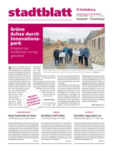 WOHNEN Richtfest in MTV-West 122 Wohnungen im Bau In der Neuen Südstadt entstehen 122 neueWohnungen. Entlang der John-Zenger-Straße und EleonoreSterling-Straße errichtet dieMTV Bauen undWohnen in acht Gebäuden 68 Mietwohnungen für Hauhalte mit unteren und mittleren Einkommen sowie 54 Eigentumswohnungen. DieWohnungen sind etwa zwischen 49 und 185 Quadratmetern groß und alle barrierefrei zugänglich. Das Quartier MTV-West ist Teil der umfassenden Entwicklung des Mark Twain Village in der Südstadt. S. 4 ›. KINDERBETREUUNG Neue Fachkräfte für Kitas Verstärkung aus Kolumbien Mehr als 9.000 Kilometer Luftlinie trennen die neuen Erzieherinnen und Erzieher von ihremHeimatland. 13 Frauen und einMannmit Hochschulabschluss in Frühpädagogik sind jetzt aus Kolumbien in Heidelberg angekommen, umdie Teams in vier städtischen Kindertageseinrichtungen und neun von freien Trägern inHeidelberg zu unterstützen. Die Vermittlung der Fachkräfte erfolgte imRahmen eines Pilotprojekts der Zentralen Auslands- und Fachvermittlung der Bundesagentur für Arbeit. S. 3 › FASTNACHT Die tollen Tage stehen an Fastnachtszug am 17. Februar Traditionell wird die Fastnacht eingeläutet mit dem Sturm der Kurpfälzer Trabanten am Rosenmontag, 16. Februar, auf das Rathaus. BeimFastnachtszug am Dienstag, 17. Februar, schlängelt sich der närrische Reigen durch die Stadt. Der Zug formiert sich in der Bergheimer Straße und setzt sich ab 14.11 Uhr in Bewegung. Er führt über den Bismarckplatz durch die Hauptstraße bis zum Rathaus/Marktplatz, wo Oberbürgermeister Eckart Würzner der Rathausschlüssel zurückgegeben wird. S. 8 › Auf dem ehemaligen US-Areal Patton Barracks entwickelt die Stadt Heidelberg mit demHeidelberg Innovation Park (hip) einWirtschaftsquartier für die digitale Zukunft. Der Standort richtet sich an Start-ups und etablierte Unternehmen aus den Bereichen Künstliche Intelligenz, IT und Lebenswissenschaften, die dort interdisziplinär zusammenarbeiten. Perspektivisch sollen im hip bis zu 4.000 Menschen arbeiten. Bereits heute sind über 100 Unternehmen angesiedelt. Rund 1.000 Beschäftigte arbeiten dort bereits an Innovationen. Weitere Firmen planen, sich dort anzusiedeln. „Der hip verbindet innovative Unternehmen mit Heidelbergs Stärke als herausragender Forschungs- und Wissenschaftsstandort und bringt Menschen, Ideen und Projekte zusammen“, so Oberbürgermeister Eckart Würzner. Die bereits umgenutzten historischen Stallungsgebäude im hip sind Standort für Unternehmen aus Design, Technologie, Künstlicher Intelligenz, Marketing und Event und tragen gemeinsam mit dem gastronomischen Angebot zur Belebung des Areals bei. Begrünte Plätze Die Entwicklung des Areals steht jetzt vor einemwichtigenMeilenstein: Die Stadt und die Entwicklungsgesellschaft Patton Barracks (EGP) starten mit der Herstellung der ersten hipFreianlagen. „Jetzt kommen nun auch die passenden Orte imFreien dazu: Grünanlagen und attraktive begrünte Plätze zum Begegnen und Durchatmen – für die Beschäftigten im hip ebenso wie für alle Bürgerinnen und Bürger. Das stärkt die Campus-Atmosphäre und erhöht die Attraktivität des Standorts für Fachkräfte weiter“, sagt Würzner. In die Planung sind zahlreiche Ideen von Bürgerinnen und Bürgern eingeflossen, die im Zuge mehrerer Beteiligungsformate gesammelt wurden. „Auf den Flächen entstehen Angebote für unterschiedliche Nutzungen – von Außengastronomie über Verweil- und Begegnungsorte bis hin zu sportlicher Betätigung. Gleichzeitig verbessern wir die Verbindung für Fuß- und Radverkehr, pflanzen rund 60 neue Bäume, naturnaheWiesen und sorgen für ökologische Qualität imQuartier“, ergänzt Raoul Schmidt-Lamontain, Bürgermeister für Umwelt, Klimaschutz undMobilität. Der Gemeinderat hatte die Umsetzung der Freiflächen im Jahr 2023 beschlossen. fr Mehr dazu auf S. 2 › Grüne Achse durch Innovationspark Arbeiten an Freiflächen im hip gestartet Nächste Stadtblatt- Ausgabe am 25. Februar Große Freude bei OB Würzner (3. v. r.), Bürgermeister Raoul Schmidt-Lamontain (4. v. r.) und Götz Gramlich (Gesellschafter Tdrei) sowie Vertretern vom Landschafts- und Forstamt und dem Amt für Wirtschaftsförderung (Foto Rothe) Amtsanzeiger der Stadt Heidelberg 11. Februar 2026 / Ausgabe 5 / 34. Jahrgang www.stadtblatt. heidelberg.de www.heidelberg.de/ bekanntmachungen