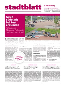 www.stadtblatt. heidelberg.de www.heidelberg.de/ bekanntmachungen Amtsanzeiger der Stadt Heidelberg 29. April 2026 / Ausgabe 13 / 34. Jahrgang KURFÜRSTEN-ANLAGE Eine Fahrbahn weniger Arbeiten bis 13. Mai In der Kurfürsten-Anlage wird ab Montag, 4. Mai, ab der Kreuzung Mittermaierstraße die Fahrspur in Fahrtrichtung Westen voll gesperrt. Grund sind notwendige Instandsetzungsarbeiten der Stadtwerke Heidelberg an einem Fernwärme-Schacht auf Höhe der Kurfürsten-Anlage Hausnummer 62. Die Sperrung dauert bis Mittwoch, 13. Mai. Der Autoverkehr wird je nach Fahrziel über die Speyerer Straße/Montpellierbrücke, den Czernyring und die Czernybrücke umgeleitet. Der öffentliche Nahverkehr ist nicht betroffen. WIRTSCHAFT Job-Event „explore us“ Am 8. Mai im Pfaffengrund An Betriebsführungen teilnehmen, sich mit Auszubildenden und Personalverantwortlichen austauschen und die eigenen Fähigkeiten in verschiedenen Berufsfeldern ausprobieren: Beim Job-Event im Gewerbegebiet Pfaffengrund am Freitag, 8. Mai, können Interessierte von 11 bis 18 Uhr rund 20 Unternehmen aus verschiedenen Branchen kennenlernen. Veranstaltet wird der Tag vom Bündnis für Ausbildung und Arbeit, das von der Stadt koordiniert wird. Sie präsentiert sich dort ebenfalls als Arbeitgeberin. www.arbeit-heidelberg.de KOMMUNALE FINANZEN Konsolidierung geht weiter Nachtragshaushalt genehmigt Das Regierungspräsidium Karlsruhe hat den Nachtragshaushalt 2026 der Stadt Heidelberg genehmigt. „Die Genehmigung ist ein erster Erfolg unseres Konsolidierungskurses. Wir erhalten dadurch wieder etwas mehr Luft zum Atmen, weil wir wieder ordentliche Kredite für Investitionen aufnehmen können. Klar ist aber auch: Wir haben erst eine erste Etappe gemeistert. Wir sind noch lange nicht am Ziel und werden unseren Konsolidierungskurs konsequent fortsetzen“, betont Oberbürgermeister Eckart Würzner. Auch dieses Jahr feiern die Stadtverwaltung und viele Beteiligte aus der neuen Südstadt wieder den Tag der Städtebauförderung. Am Samstag, 9. Mai, findet von 11 bis 17 Uhr ein abwechslungsreiches Programm für Groß und Klein auf der ganzen Konversionsfläche statt – mit Flohmarkt, „Mario Kart“ spielen auf der Kinoleinwand, Tischtennis, Wurfspiel für Kinder und vielem mehr. Es gibt spannende Einblicke, interessante Informationen und viele Möglichkeiten, die Entwicklung des Areals hautnah zu erleben – ideal für alle, die neugierig sind und die neue Südstadt besser kennenlernen möchten. Die Städtebauförderung von Bund und Land unterstützt die Entwicklung des Quartiers mit insgesamt rund 23 Millionen Euro. 10-jähriges Jubiläum Unter dem Motto „10 Jahre jung, 10 Jahre bunt, 100 %Wir“ feiert die neue Südstadt im Jahr 2026 ihr Jubiläum. Seit der Übergabe der ehemaligen US-Militärflächen Mark-Twain-Village und Campbell Barracks an die Stadt Heidelberg im Jahr 2016 hat sich das Areal mit hoher Dynamik zu einem offenen, urbanen und vielfältigen Quartier mit hoher Lebensqualität entwickelt. Zehn Jahre nach dem Start der Entwicklung sind bereits rund drei Viertel der Flächen erfolgreich realisiert. Dieses Jubiläum wird mit zahlreichen Aktionen gefeiert, die Lust machen, immer wieder vorbeizuschauen. Programmauszug › 1 1.15 Uhr: Eröffnung mit demErsten Bürgermeister Jürgen Odszuck vor der Chapel › 11.15 bis 13 Uhr: Musik an der Chapel › 11.30 Uhr: Führung durch das Kreativwirtschaftszentrum „Marlene 42“ › 13 bis 17 Uhr: Musik am Checkpoint › 13 Uhr: Führung durch das MarkTwain-Center › 14 bis 17 Uhr: Waffelcafé in der Chapel Seit 2016 wird der Tag der Städtebauförderung in Heidelberg begangen. Die Städtebauförderung unterstützt die Entwicklung nachhaltiger Lebensräume, fördert Klimaquartiere, attraktive Freizeit- und Bewegungsräume sowie eine sozialgerechte Quartiersentwicklung. lst www.heidelberg.de/ neuesuedstadt Neue Südstadt bei Fest erkunden Führungen, Aktionen, Flohmarkt und mehr am 9. Mai Nächste Ausgabe am 13. Mai Der Tag der Städtebauförderung fand bereits 2023 in der neuen Südstadt statt. Auch dieses Jahr laden Stadt und Beteiligte aus dem Stadtteil dazu ein, das Quartier zu erkunden. (Foto Buck)
